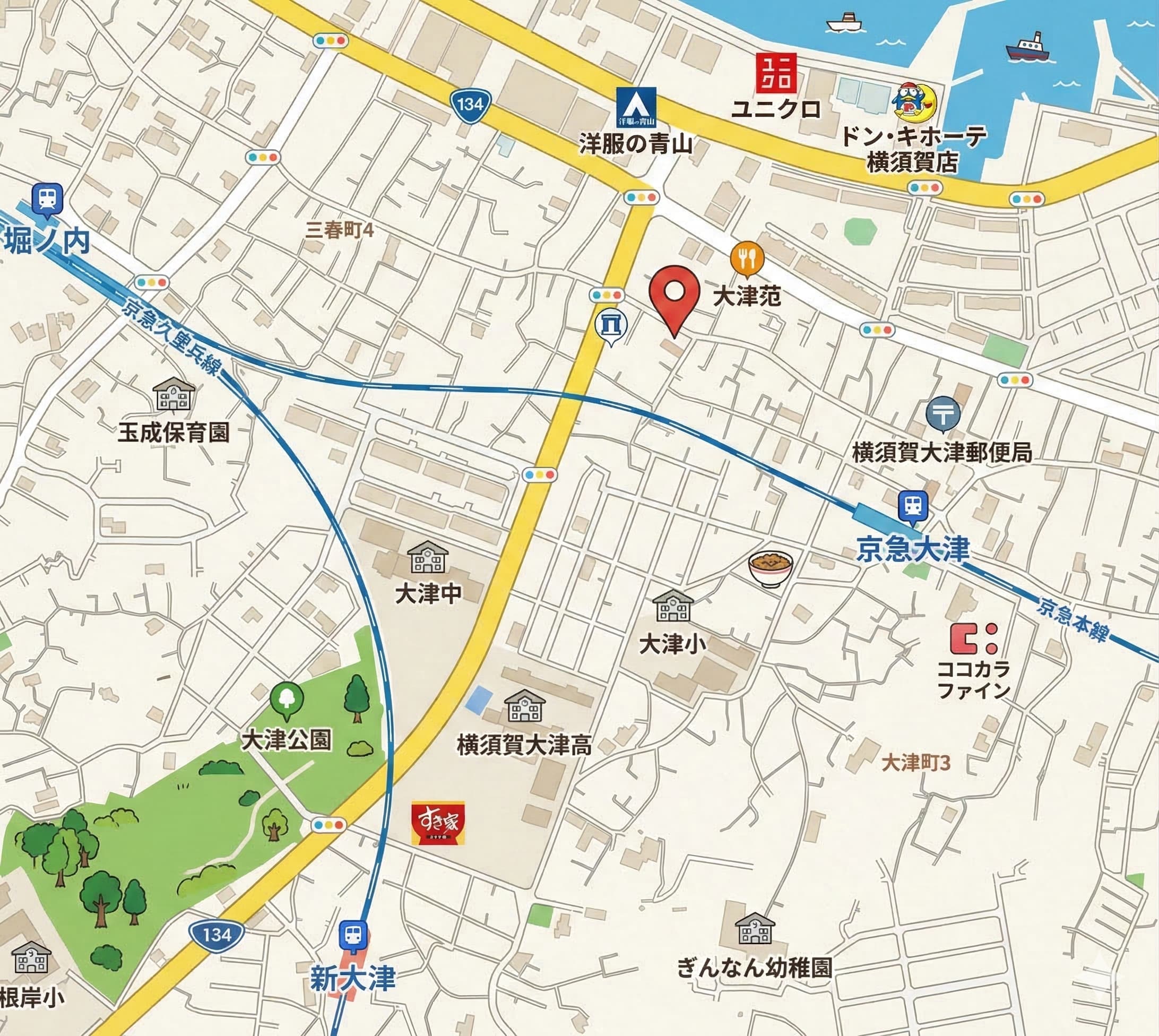 交通案内ポップアップ お車でご来院の方へご注意 当院前の道路は一方通行です。 お車等でお越しの場合は、必ず大津駅側からお入り下さい。 閉じる Yahoo地図 周辺地図 横須賀市大津町1丁目8-32 大津駅から徒歩5分で来院 京浜急行線 京急大津駅から徒歩5分(400m)改札口を背にし、かながわ信用金庫大津支店を右手に見ながら大津カトリック教会前を通過。最初の十字路で左折、大津郵便局を右手に直進すると左手です。 堀ノ内駅から徒歩10分で来院 京浜急行線 堀ノ内駅から徒歩10分(800m)駅を背にして、改札口を出たら直ぐ右に曲がり、信号で左に曲がります。海側へ直進して、最初の信号を右折して直進。1つ目の信号で国道134号線を渡り、ローソンを右手に見ながら進むと直ぐ右手にあります。 新大津駅から徒歩11分で来院 京浜急行線 新大津駅から徒歩11分(900m)久里浜街道(国道134号線)に出てから海側に向かって直進。右手にローソンがある角を右折するとすぐ右側です。 京浜急行バスで徒歩3分で来院 京浜急行バス 大津一丁目バス亭から徒歩3分(220m)バス通り(県道208号)から焼肉大津苑脇の細い道を通り突き当りを右に曲がると右前方です。 車・オートバイで来院 県道208号からセブンイレブンのある交差点を大津駅方向へ進入。最初の十字路を右折。大津郵便局を右手に見ながら、直進すると左手です。 ※当院前の道路は一方通行です。国道134号線のローソン側からの進入は出来ません。 ※駐車場11台※駐輪場5台。