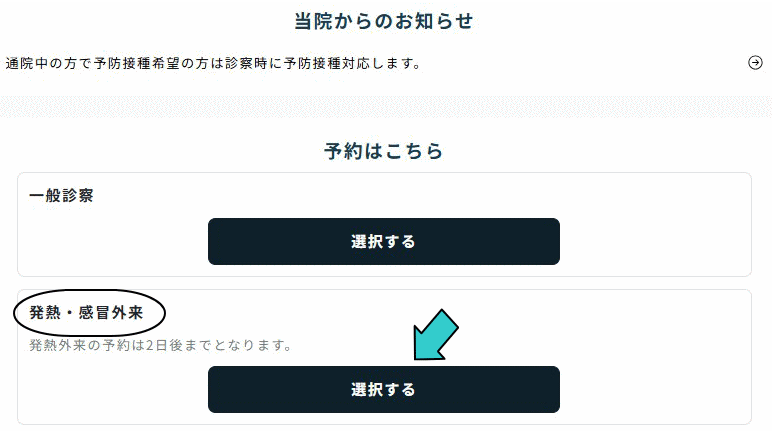 ①受診希望の方はWakumy WEB予約から発熱・感冒外来を選択